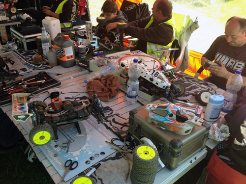 Am Start waren etliche Topfahrer der Klasse 1:8 OffRoad vertreten unter anderem Carsten Keller, zur Zeit in Topform! Daniel Reckward, mehrfacher deutscher Meister, Europameister und Weltmeister. Nicht zu vergessen Marcel Guske, Lars Simros, Nick Lorenz, sowie die Topfahrer aus Coesfeld mit Maik Wiesweg, Sven + Jan Sievert sowie Christian Bessler. Nach dem TQ von Jan beim NRW-Cup und dem zweiten Platz von Sven gute 14 Tage zuvor, gingen wir mit der Erwartung in das Rennen, dass beide unter die ersten Zehn kommen könnten. Da Sven einen neuen Motor gefahren ist, den BXR von RB, und den neuen Mugen MBX7, mussten wir den Motor und dem Auto, in Sachen Einstellung und Setup, noch den letzten Schliff geben.