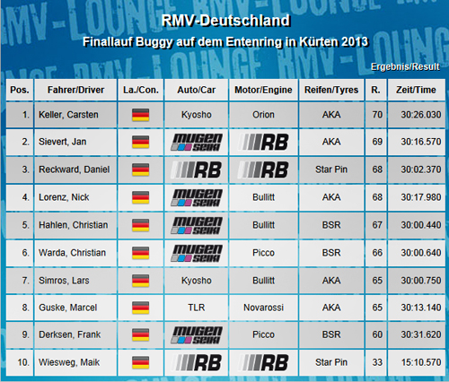 In den Halbfinalen waren es die üblichen Verdächtigen wie z.B. Marcel Guske, Maik Wiesweg und Carsten Keller, die diese dominierten und dann auch aufstiegen. Sven konnte ebenfalls an den Rennspeed anknüpfen mit seinem Mugen MBX7 wurde aber schließlich durch die starke Konkurrenz nur 8er im Halbfinale.